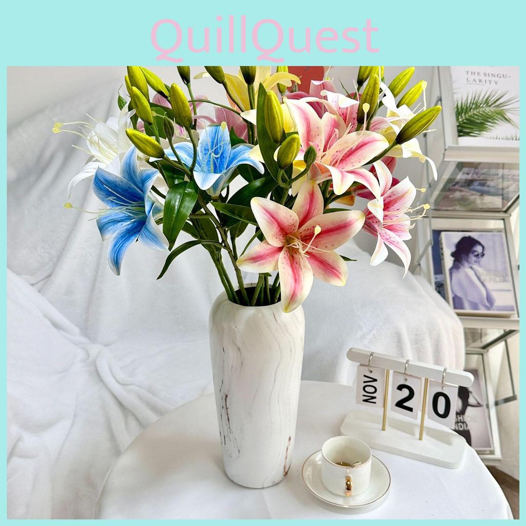 This decorative artificial lily features two lifelike blooms crafted with high-quality materials for enhanced realism. It measures approximately 67cm in height, with durable polyester petals and a sturdy plastic stem. The realistic design complements wedding decor, photography setups, or home interior accents. Wipe clean with a damp cloth for maintenance.