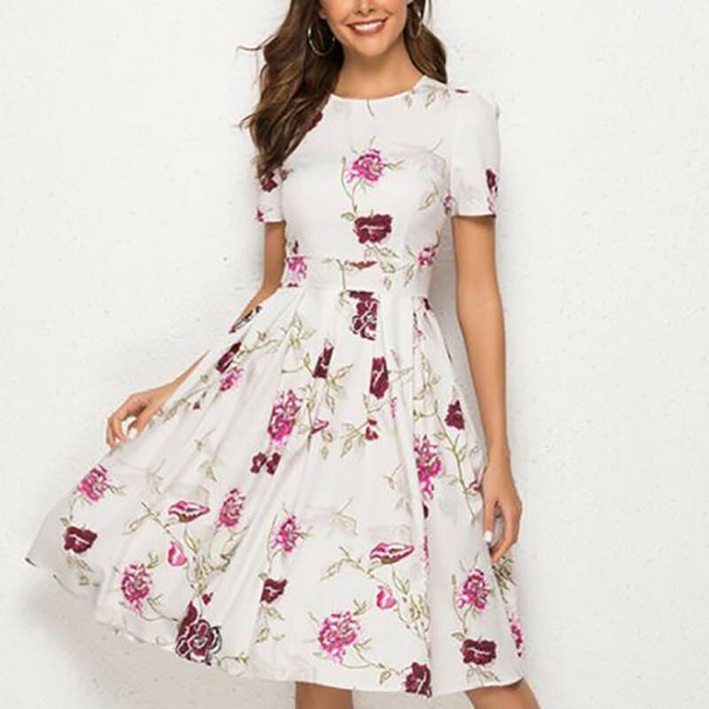 Summer Women Vintage A-Line Dress Tunic Long Short Sleeve Floral Print Sundress
