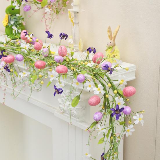 This easter garland features high-quality PE+PVC mixed rattan, offering a realistic texture with soft, matte-coated leaves and eggs. Crafted from environmentally friendly materials, it is odorless and meets interior decoration safety standards. Designed for versatile use, it can be hung on doors, walls, or windows, or wrapped around candlesticks and photo frames to enhance living rooms, dining tables, shopping malls, or greenhouses with festive charm.