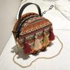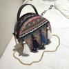 This small round crossbody bag features a durable woven material with a moisture-resistant PU exterior, It showcases a chain strap, tassel accents, and a zippered closure, supporting essentials like a smartphone in its internal pocket. Ideal for casual outings or travel, it offers a lightweight design for comfortable carrying. Wipe clean with a damp cloth to maintain its appearance.