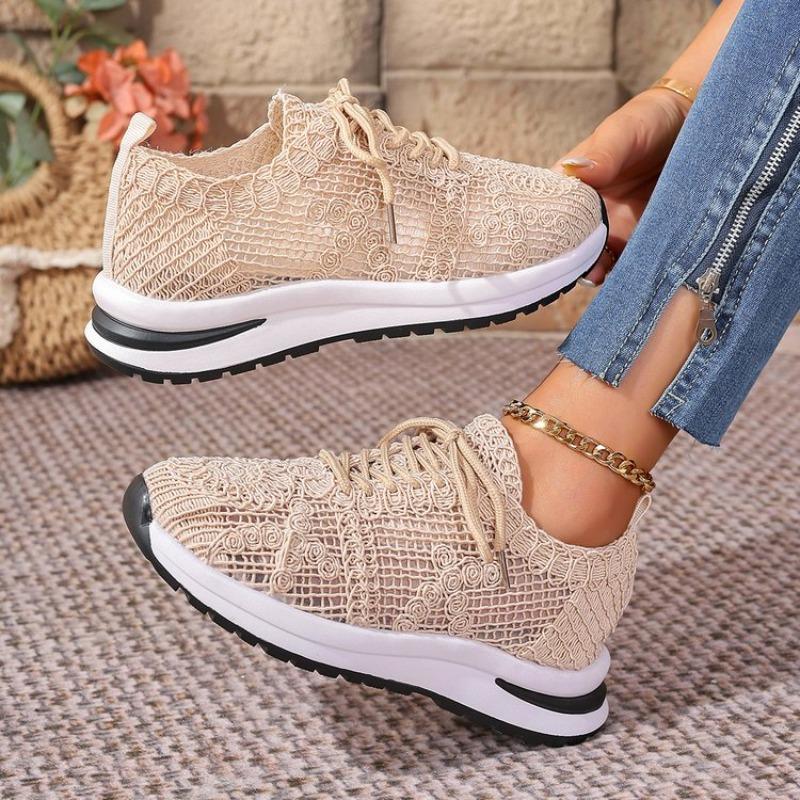 Fashion Casual Breathable Mesh Sports Shoes Women Summer Lace Up Soft Sole Medium Heel Sneaker Fashion Lace Hollow Out Running Shoes