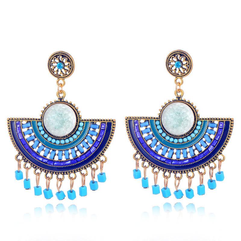 Trendy Geometric Fan Tassel Beaded Earrings For Women In Blue With Alloy Material