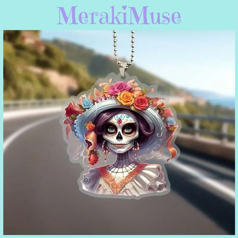 Car Decor Acrylic Halloween Cartoon Skull Flower Hat Design Pendant With Beaded Chain For Auto Interior