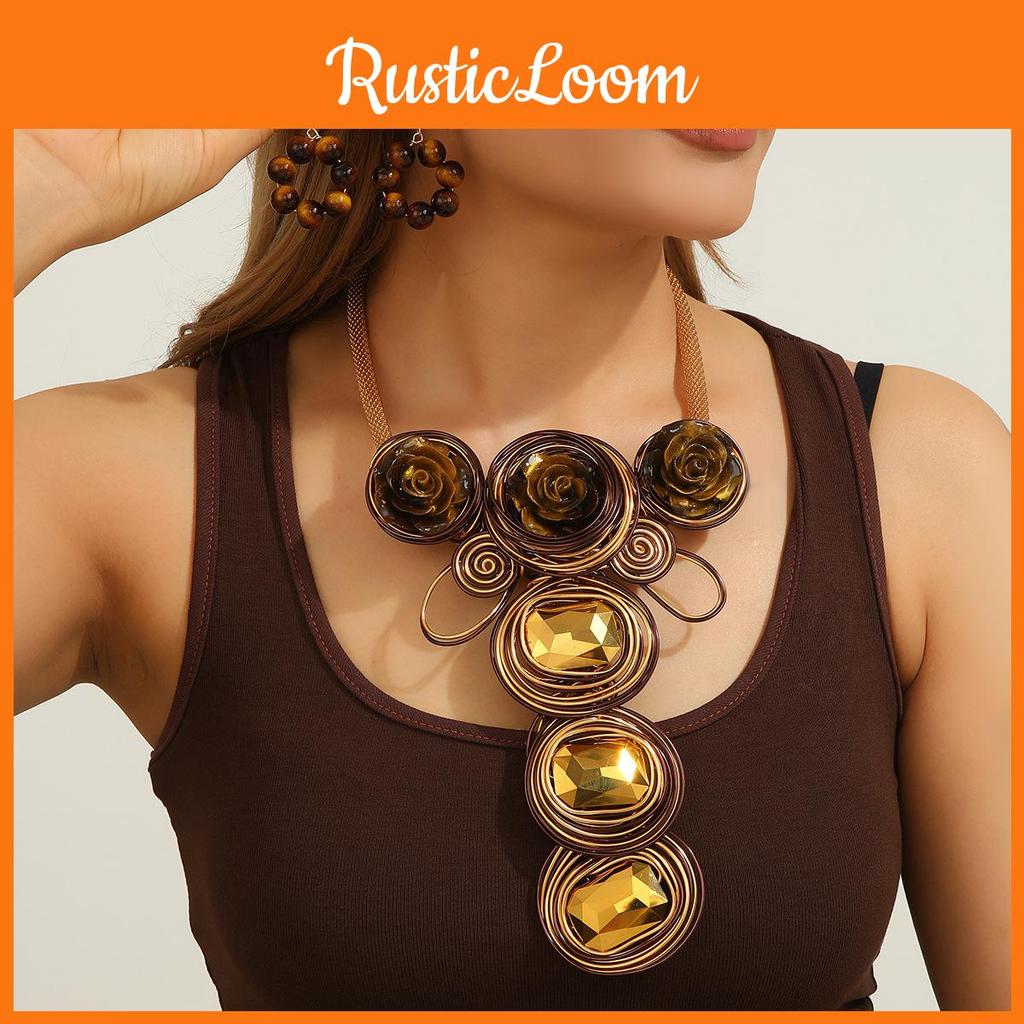 This jewelry set features a large, mixed-material design with electroplated finishing, combining crystal-like gemstones and resin flower accents. The necklace measures approximately 24 inches long with a standard chain style, while the earrings include matching motifs. Crafted for versatile wear, it suits both casual and formal occasions. Ideal for spring 2025 fashion trends, it adds a bold, artistic touch to any ensemble. To maintain its shine, wipe with a soft, damp cloth.