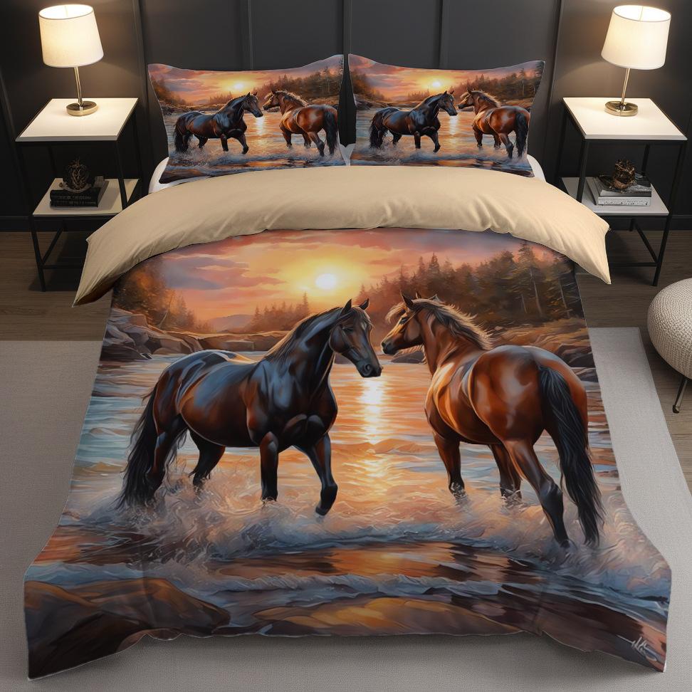 Three-Piece Bed Set, Xiyin 3D Digital Printing Polyester Polished Sunset Galloping Horse Quilt Cover
