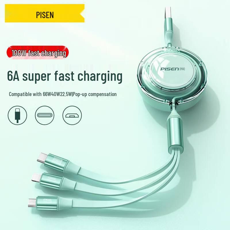 Pisen 6A Fast Charge 3-in-1 Retractable Data Cable