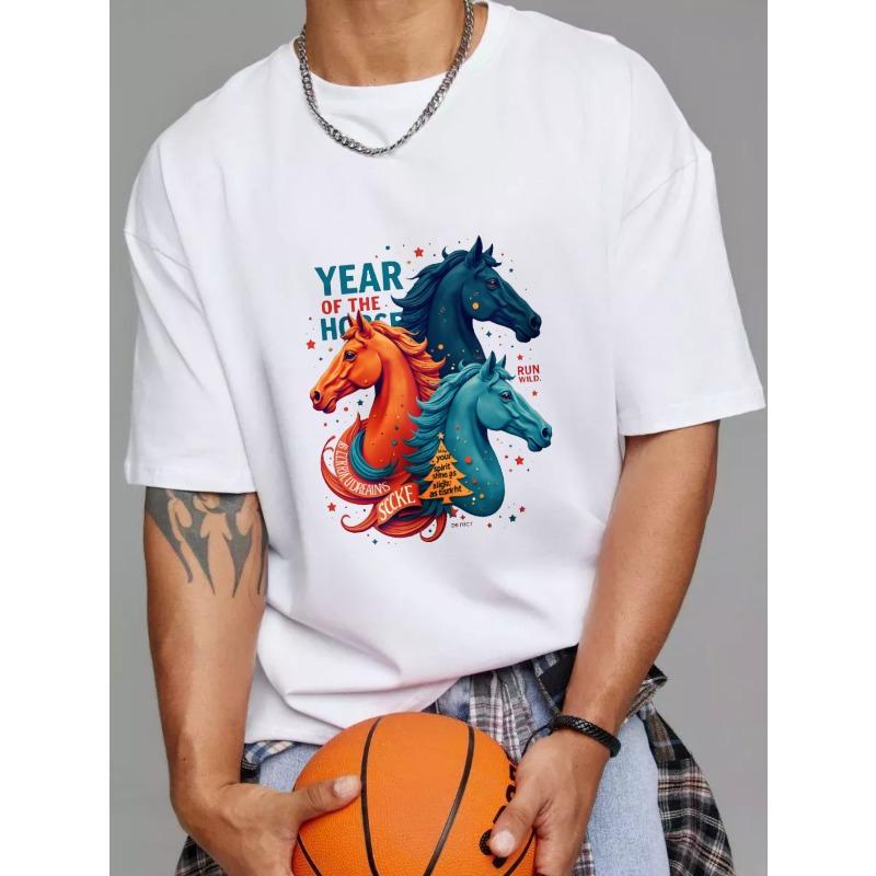 Crewneck T Shirt White Year of The Horse Three Colorful Horses and Stars Print Casual Wear for Men and Women