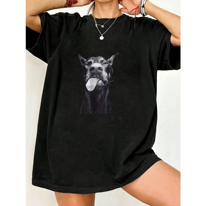 Oversized T Shirt Black Dog Face Print Casual Wear For Women Summer Streetwear Fashion Top