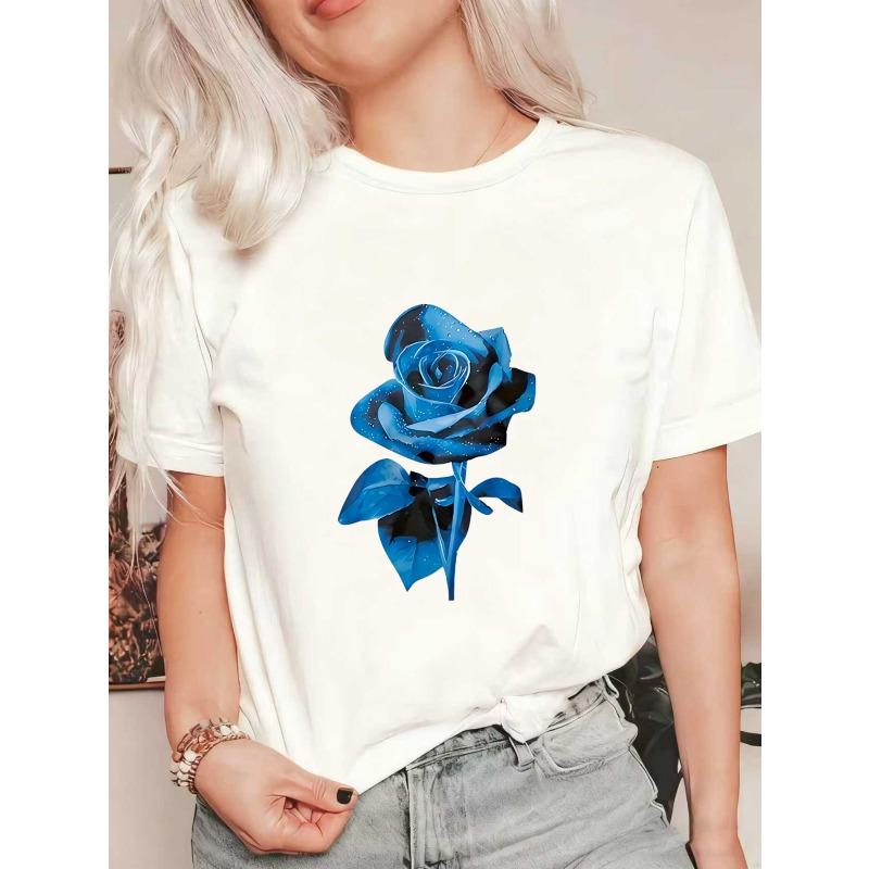 Oversized T Shirt Black Blue Rose Print Casual Wear For Women Summer Outfit Street Style Fashion Top