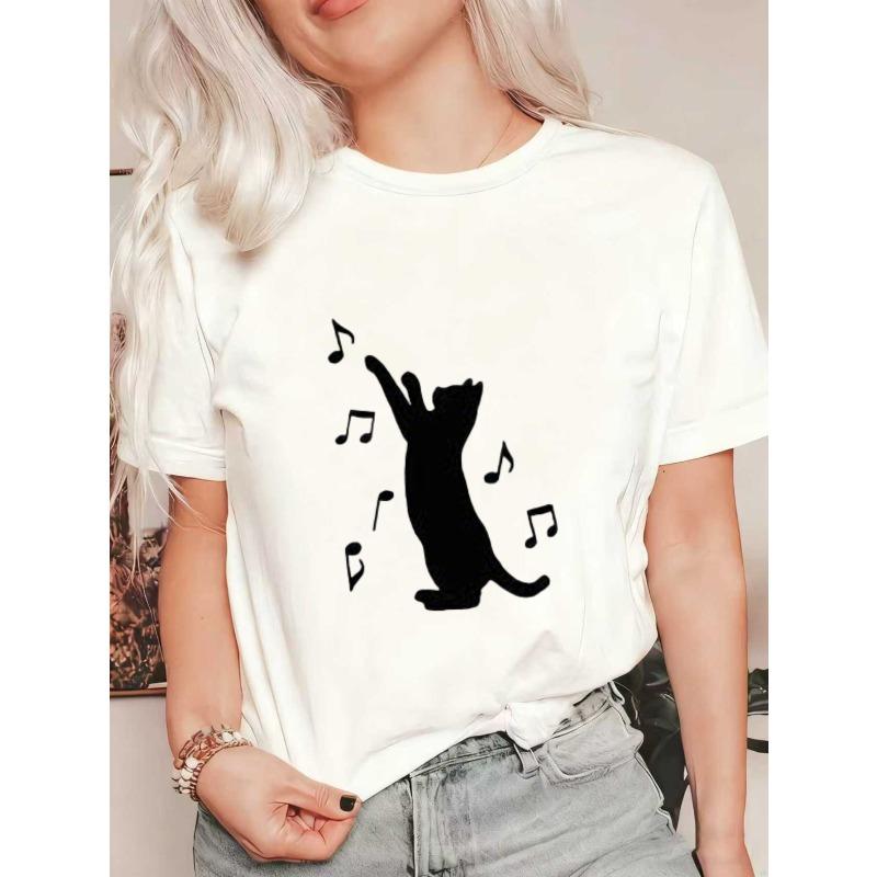 Black Oversized T Shirt With Cat And Music Notes Print For Casual Wear