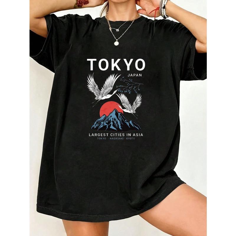 Oversized T Shirt Black Tokyo Japan Mount Fuji Cranes Print Largest Cities In Asia Graphic Tee For Casual Wear Travel And Daily Outfits