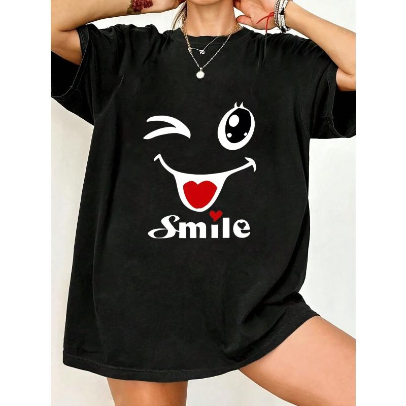 Black Oversized T Shirt With Winking Face And Smile Text For Casual Wear