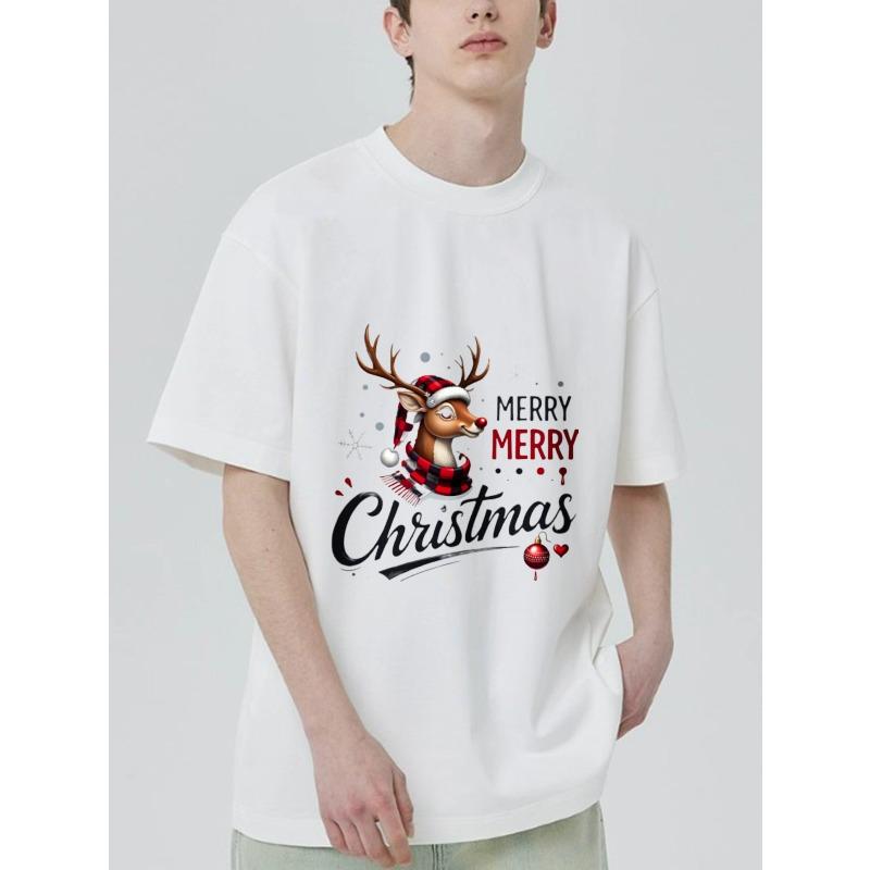 Christmas T Shirt Black Reindeer with Santa Hat and Scarf Merry Christmas Text Holiday Party Wear
