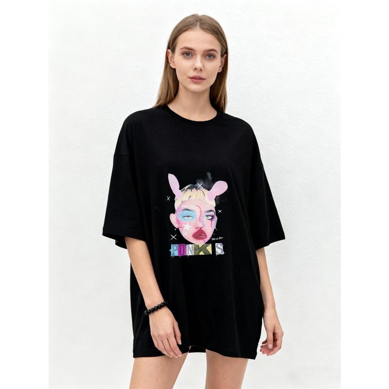Oversized T Shirt Black Punk Style Graphic Print With Rabbit Ears And Colorful Face Art For Casual Wear