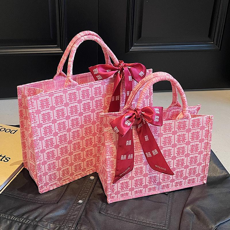 New Wedding Red Fashion Portable Tote Bag Women's Large-capacity Niche Design Baixi Character Canvas Wedding Bag