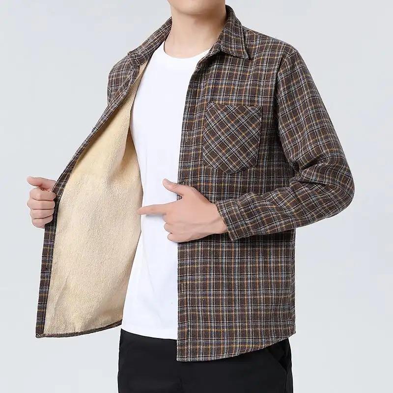 Men's Clothing Autumn and Winter Plaid Contrast Button Cardigan Lapel Long Sleeve Shirts Top