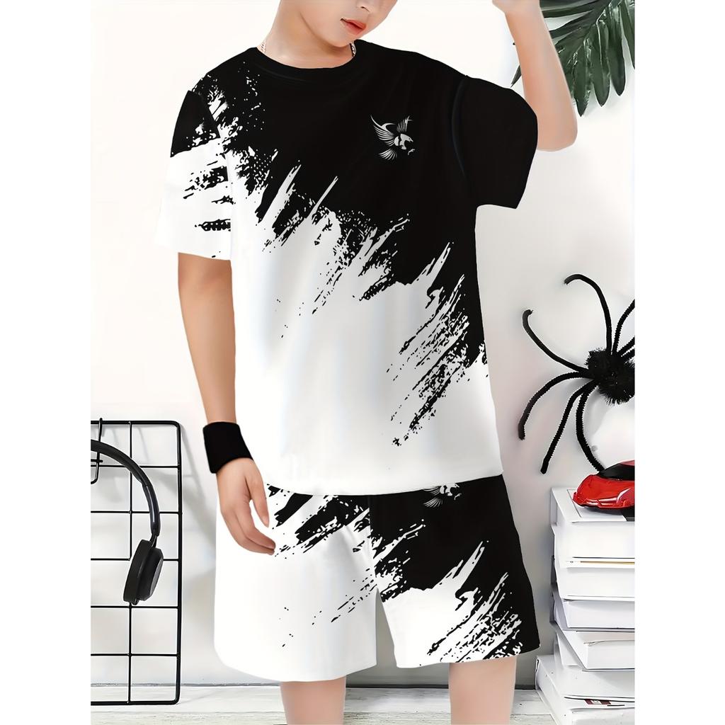 Summer New Gradient Print Top Short Sleeve Shorts Two-Piece Boys' Shirt Set, Perfect for Outdoor