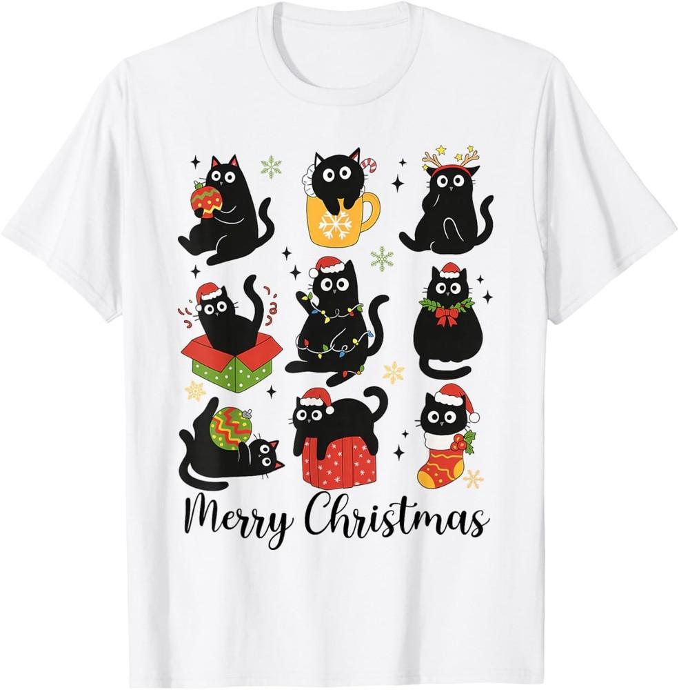 Meow Christmas Xmas Lights Black Cat Pajamas Family Funny T-Shirt