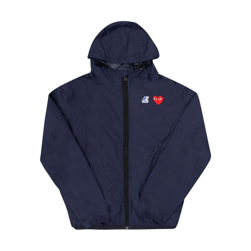 The COMME DES GARCONS Red Double Heart Wappen Jacket AZ-J501-051 is a collaboration product with the French outdoor brand K-WAY, crafted as a lightweight windbreaker. The front features the iconic 'Double Heart' wappen of COMME DES GARCONS, emphasizing the brand's identity. It is suitable for both men and women, making it practical for both everyday wear and active use.