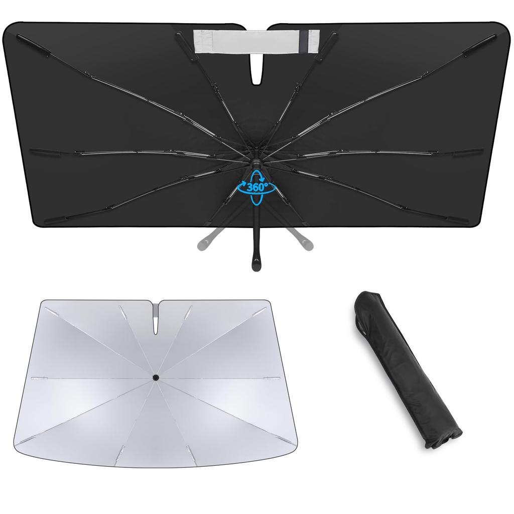 [Bendable Handle & 10 Fiberglass Ribs] This new-for-2024 umbrella-style car sunshade features a unique design with a bendable handle that can be adjusted 360° to fit your needs. It offers better protection from scratches to dashboards and interiors than conventional stainless steel umbrella handles. The center rod is made of 10 sturdy, upgraded fiberglass ribs, combining flexibility and strength. The anti-corrosion treatment makes this umbrella-style sunshade ultra-tough, rust-resistant, and durable.