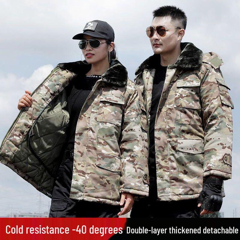 Men's and Women's Army Green Camouflage Winter Coat, Cotton-Padded, Mid-Length, Plus Velvet, Thickened for Cold Protection.