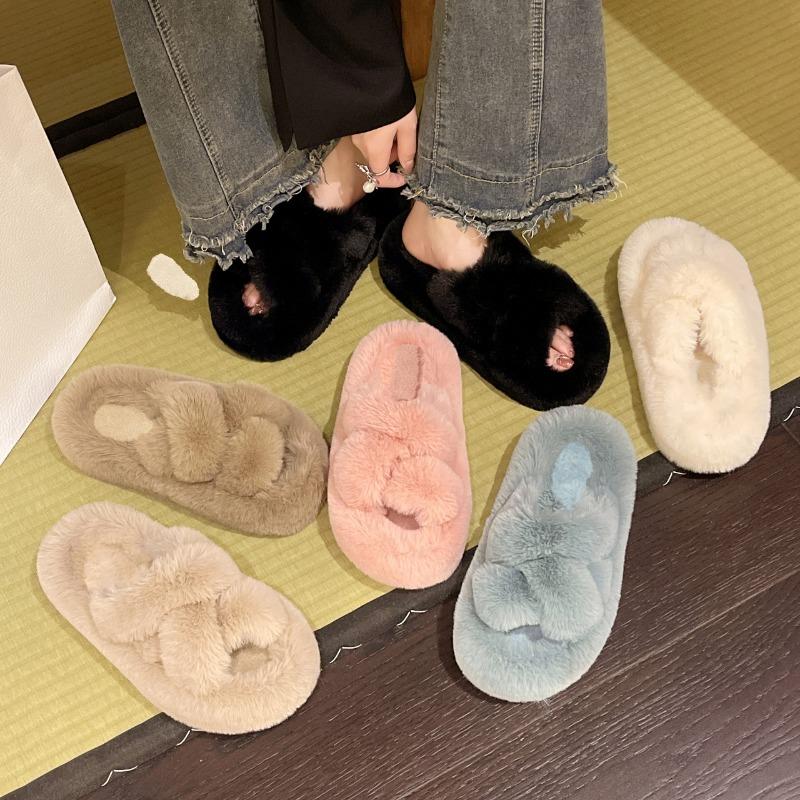 Fashion 2025 New Women Furry Fur Slippers Soft Faux Fur Slides Ladies Plush House Slippers Open Toe Flat Sandals Fluffy Warm Shoes