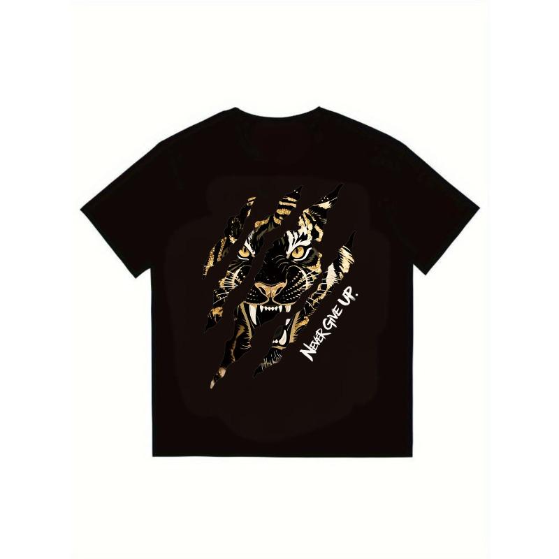 Black T Shirt Tiger Graphic Never Give Up Print Casual Streetwear Men's Fashion