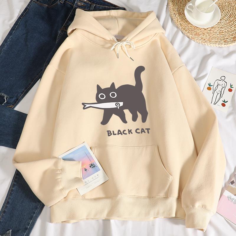 Casual Women's Hoodie Black Cat Eating Fish Printed Sweatshirt Breathable Loose Warm Pullover 2025 Autumn and Winter Streetwear