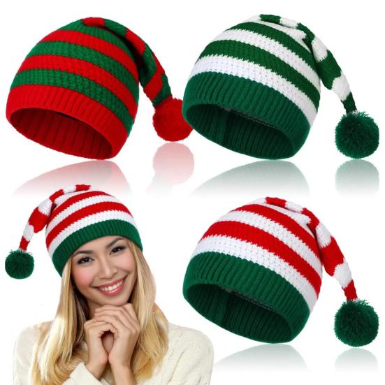 Santa Hat Red White Green Striped Print Knitted Christmas Hat with Plush Ball Decor Holiday Accessory