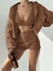 Stay active in style with this trendy ribbed cropped hoodie and shorts set, available in five versatile colors. The deep V-neck hooded top is designed with a relaxed fit and a cropped length, perfect for pairing with the matching high-waisted shorts. The ribbed texture adds a subtle, fashionable detail to the soft and stretchy fabric, offering both comfort and a flattering silhouette. Ideal for workouts, casual outings, or athleisure wear, this coordinated set provides a sleek and sporty look. Mix and match the colors to refresh your activewear collection effortlessly.
