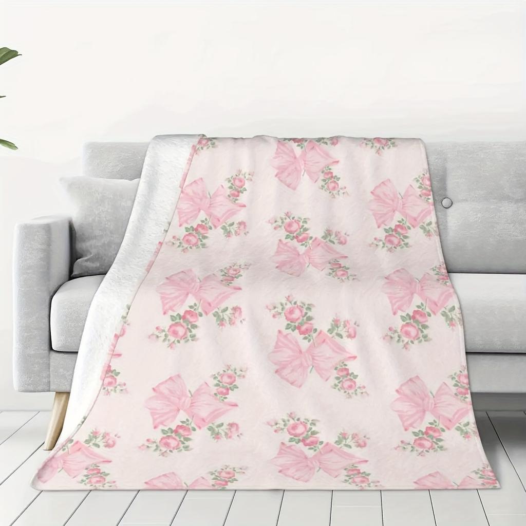 Soft Cozy Pink Bow Floral Flannel Throw Blanket Versatile for Office Camping & Travel All-Season Warmth Machine Washable