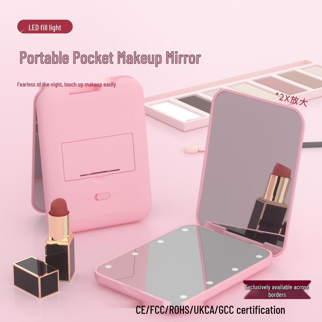 Portable LED Makeup Mirror with 2X Magnification - Handheld, Folding Design