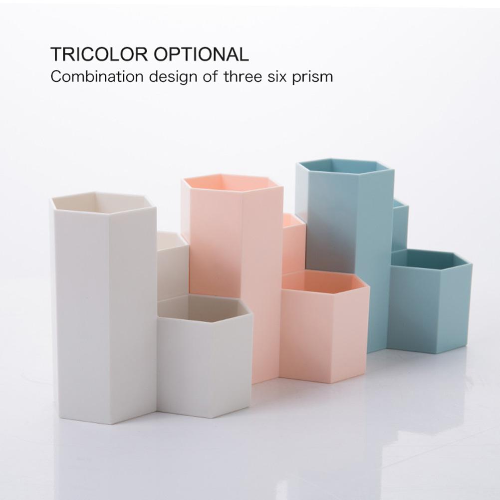 Pen Holder 3 Compartment Hexagonal Multi Function Makeup Brush Storage Bucket for Desktop Blue