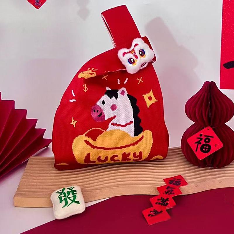 2026 New Year Cartoon Mascot Pony Knitted Gift Bag Handheld Candy Bag Large Capacity Knot Wrist Bag Cute Reusable Shopping Bags