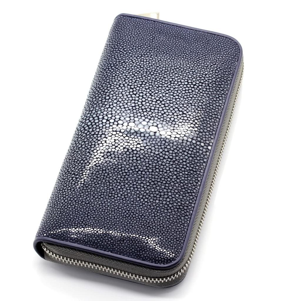 [Revetta] Stingray Leather Long Wallet with Round Zipper, Stingray and Galuchat Design, Navy Blue, Genuine Leather with Gray Leather Interior [196stw]