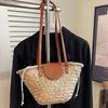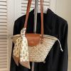 Women Straw Woven Tote Bag Fashion Woven Handbag Large Capacity Weaving Shoulder Bag with Ribbon for Outdoor Travel