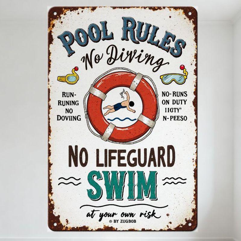 Vintage Rusty Metal Tin Sign Pool Rules No Diving with Cartoon Swimmer Life Preserver - Whimsical Pool Safety Decor for Home Bar