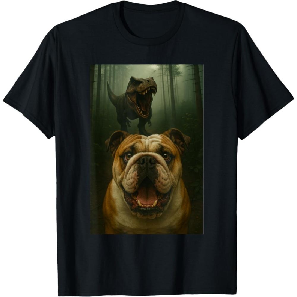 English Bulldog Dog Selfie With T-Rex Dinosaur Funny T-Shirt