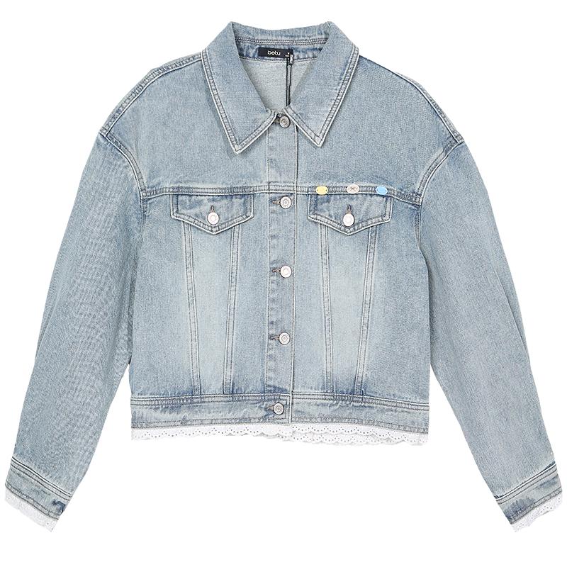Betu Women's Short Lace-Trim Washed Denim Jacket