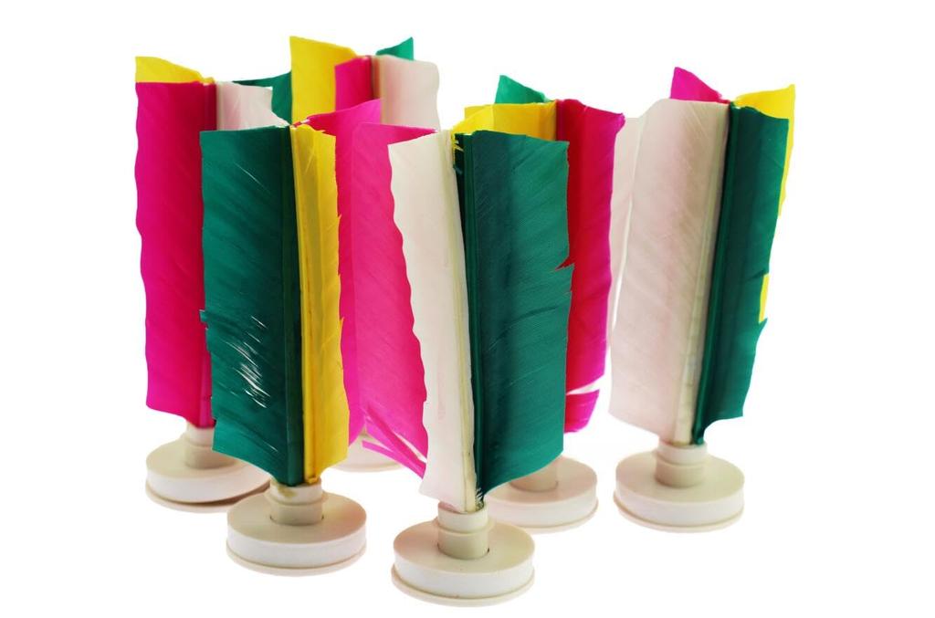 This set of six mixed-color shuttlecocks is a kicking sport in which players kick the shuttlecock using the top of their foot, heel, or knee to keep it from touching the ground.