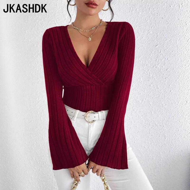 JKASHDK Women's Fashion Casual Spring Autumn Solid Color Print Long Sleeve V-Neck Blouses & Shirts