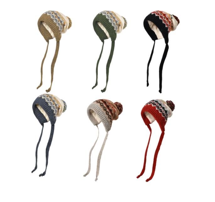 Women's Fair Isle Pullover Cap with Ear Flaps, Plush Pom-pom, Fleece , Thickened and Warm Wool Hat
