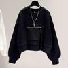 Women Loose Round Neck Long Sleeve Pullover Sweatshirt Top with Zipper Pocket Short