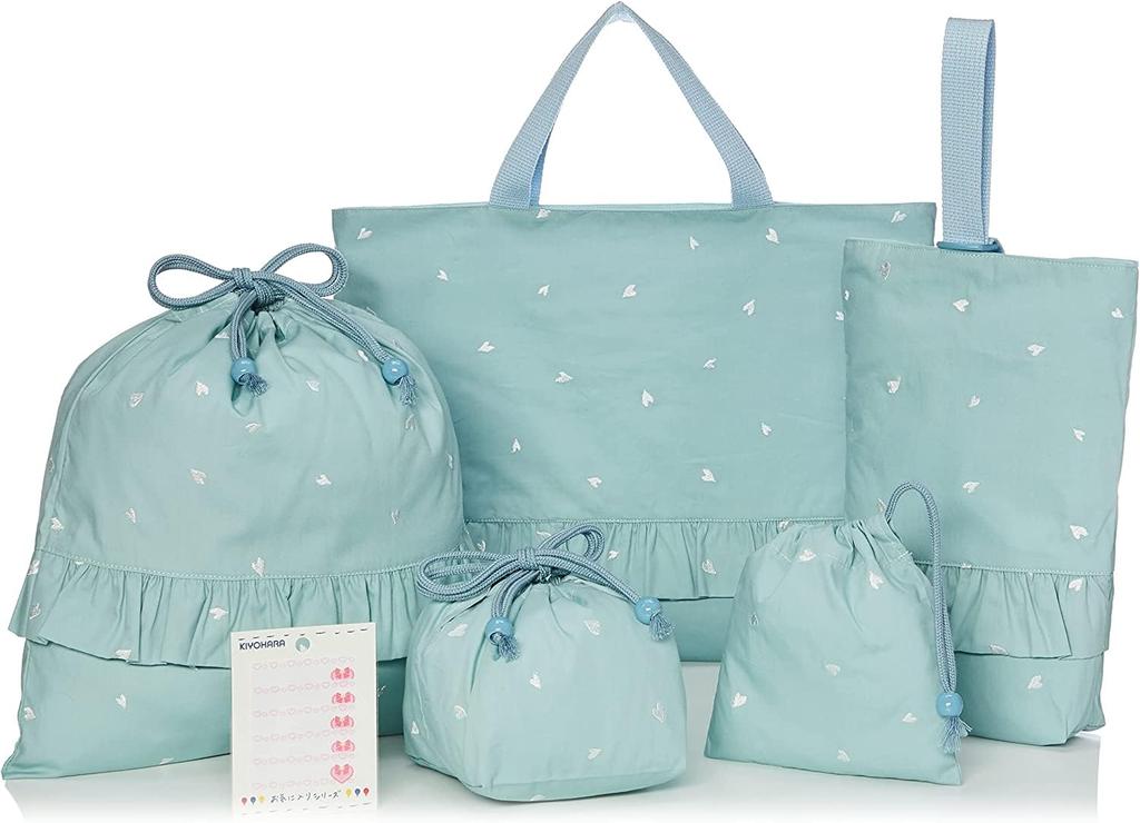Includes a school bag (school bag/sub-bag), indoor shoes bag (shoe bag), gym clothes bag (gym bag/drawstring bag/lunch bag), lunch bag, and cup bag. This set also comes with a bonus set of iron-on name stickers (5 sheets).