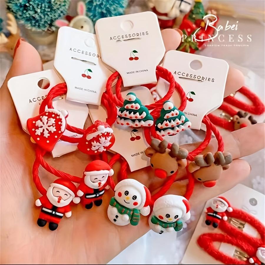 Christmas 10pcs Cute Cartoon Hair Ties, Featuring Christmas Tree and Reindeer Santa Claus Decorations, Holiday DIY Decorations