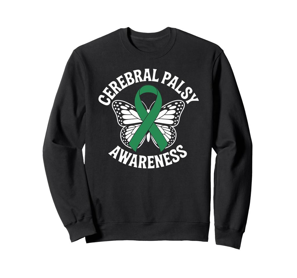 Featuring a supportive "Cerebral Palsy Awareness" design, a beautiful butterfly and green ribbon representing CP support.
