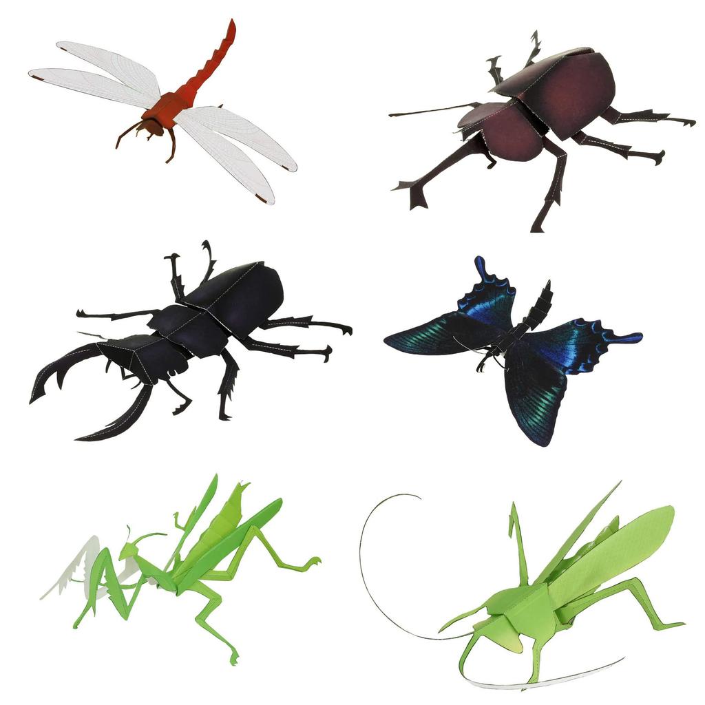 These are paper craft insects. They contain six types of insects: a rhinoceros beetle, a stag beetle, a praying mantis, a butterfly, a dragonfly, and a grasshopper. They are of such high quality that adults can enjoy them too. Because they are paper models, they are shipped in a thin and compact form.