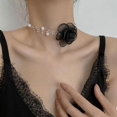 Romantic Pearls Rose Flower Choker Adjustable Black White Rose Choker Necklace Neck Accessories Gauze Clavicular Chain