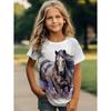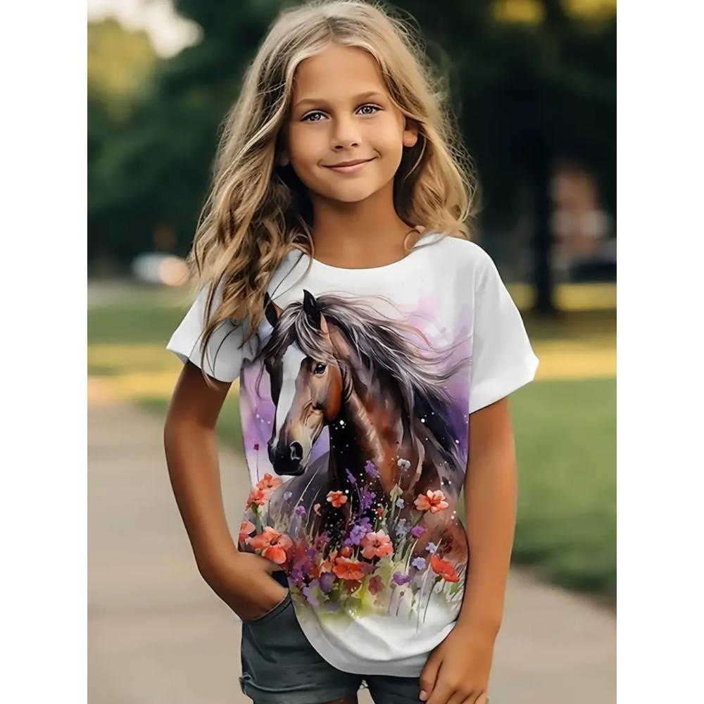 Girls' Clothing, Summer Horse 3D Printing, Outdoor Activities, Fashionable Round Neck Short Sleeved T-shirt, Girls' Quick Drying T-shirt