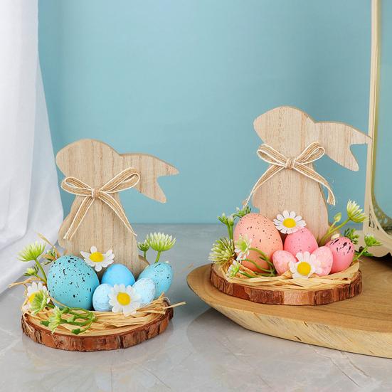 Intricate Hand-Made Details: Each element showcases meticulous craftsmanship, from the soft hand-painted patterns adorning the wooden Easter eggs to the charmingly naive rabbit shapes. Paired with carefully arranged simulated floral accents, the decoration balances simplicity with exquisite artistry, resulting in an elegant yet approachable design that captures attention.